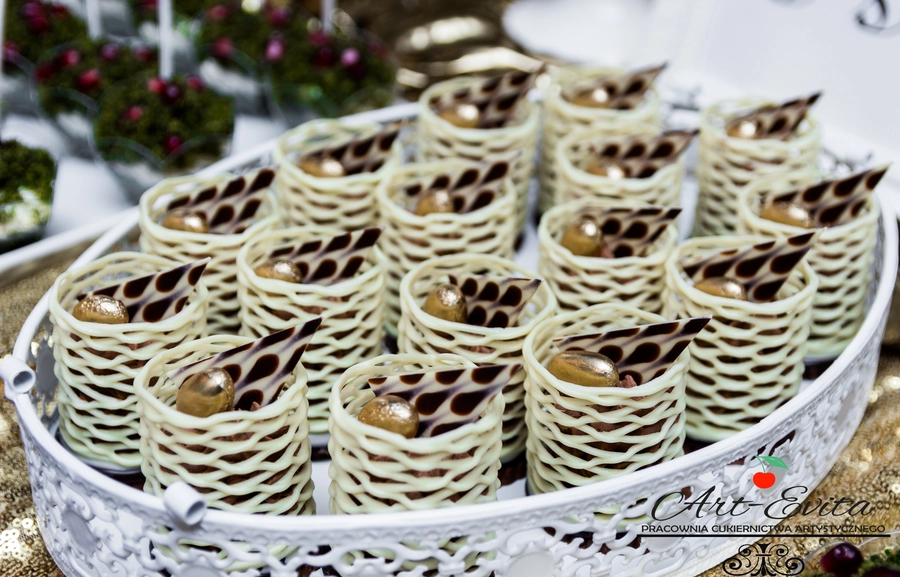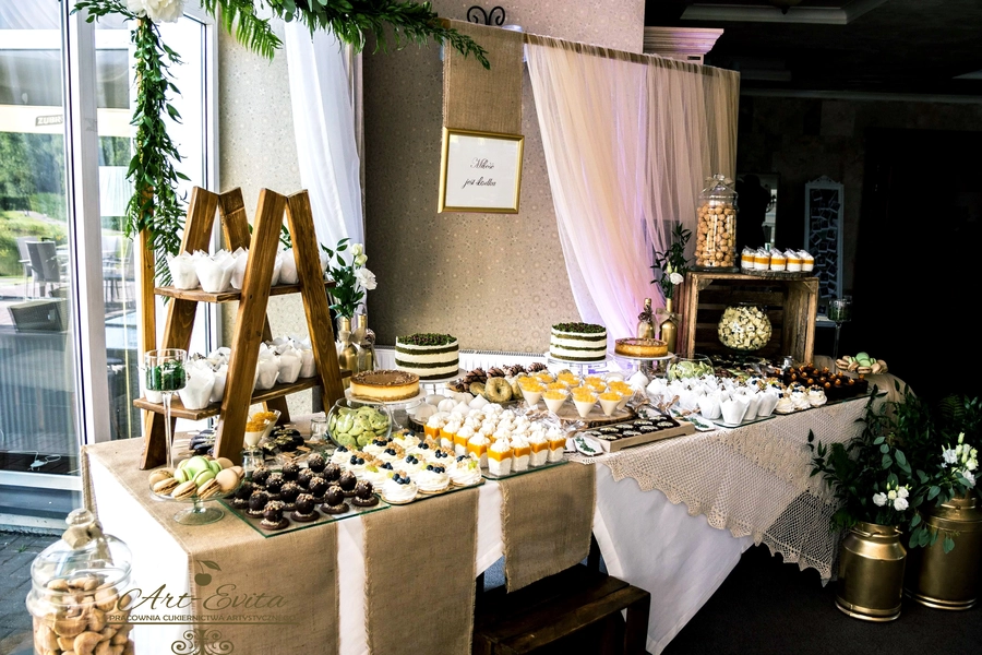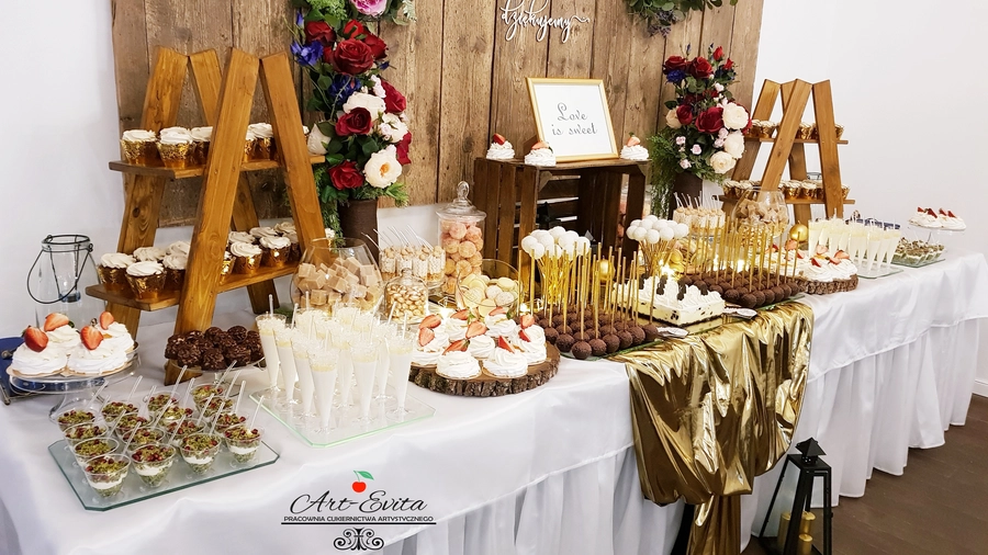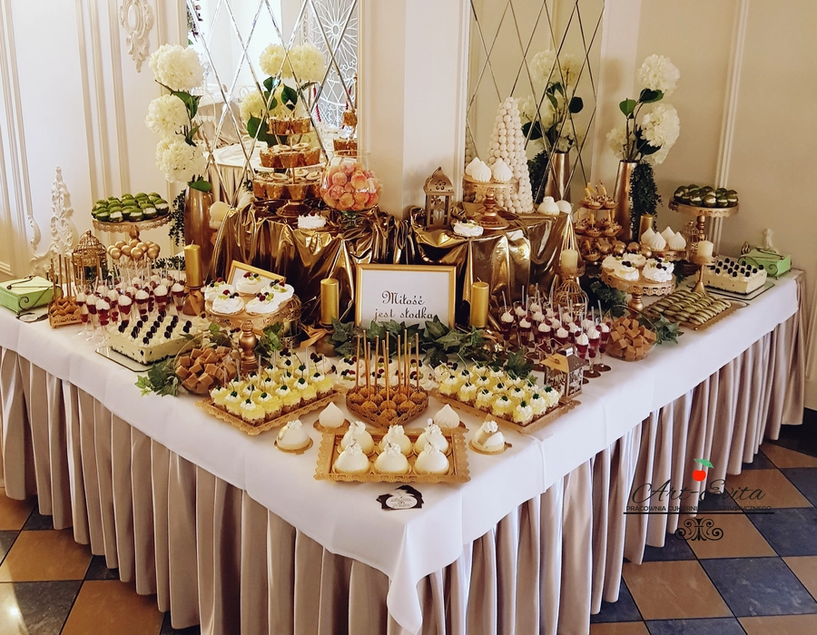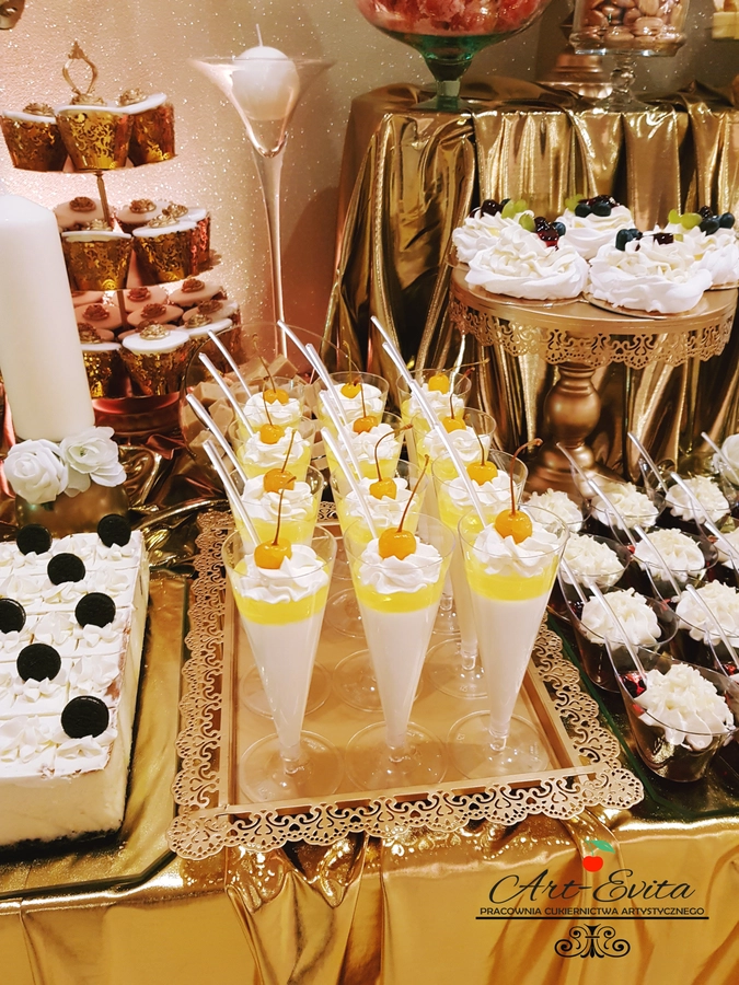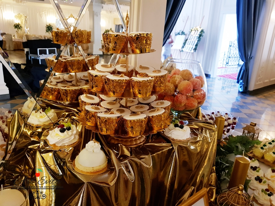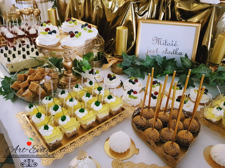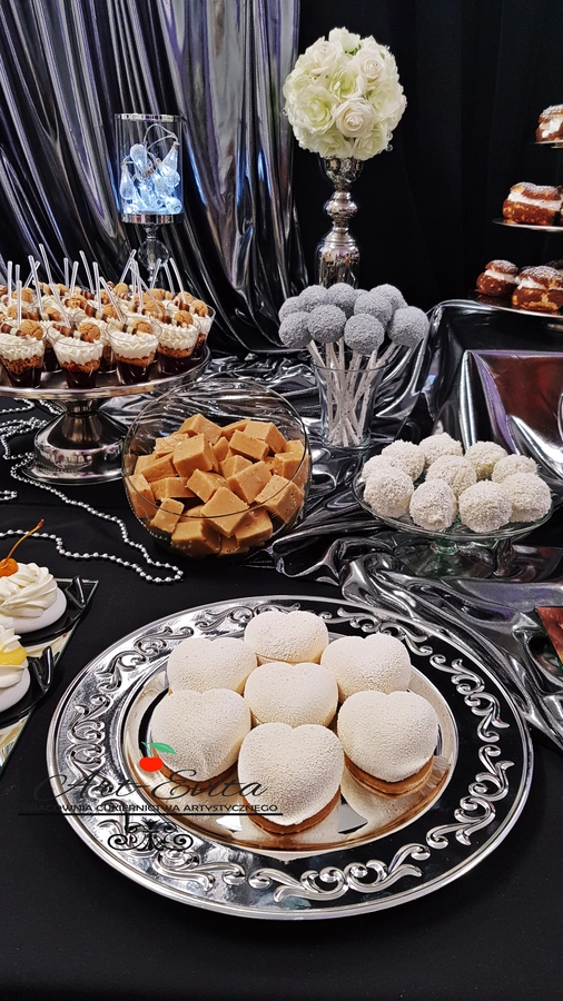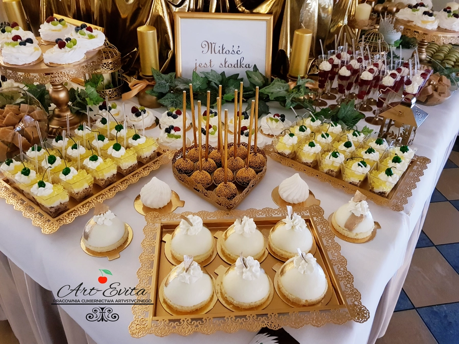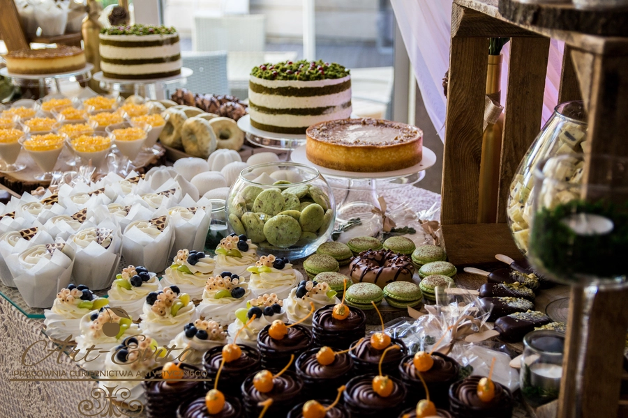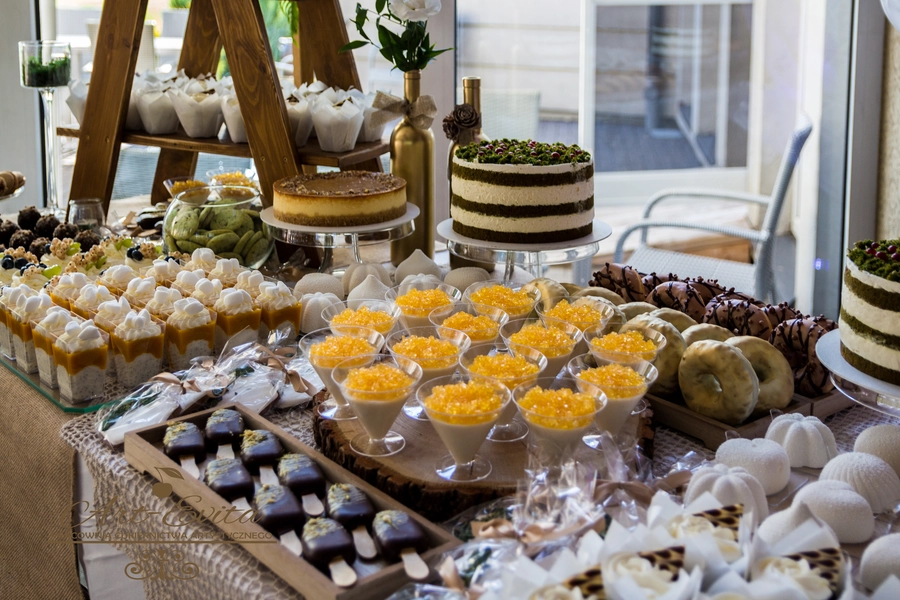 Są to przepięknie skomponowane nowoczesne słodkości w przeróżnych smakach, kolorach, w niewielkich porcjach i pojemnościach, tak aby gość weselny mógł spróbować chociaż kilku sztuk. A jest w czym wybierać! Są to mini deserki, mono porcje, mini pavlove, muffinki, cake popsy (lizaki z ciasta), pop sicles (lody z ciasta), nowoczesne oraz tradycyjne tartaletki, nowoczesne ptysie tzw. shu cakes, lizaczki bezowe, serniki o różnych smakach, tarty oraz wiele innych. Wszystko jest dowożone przeze mnie na salę, rozstawiane i dekorowane, tak aby pasowało do klimatu wesela stylem i kolorystyką.