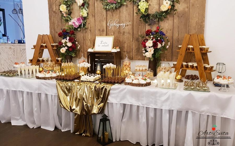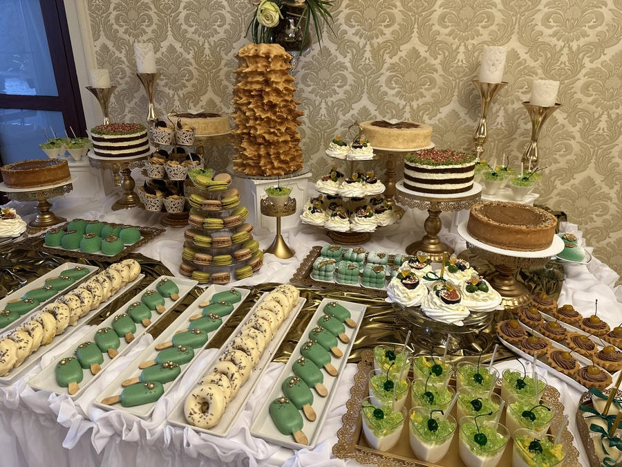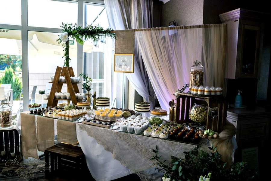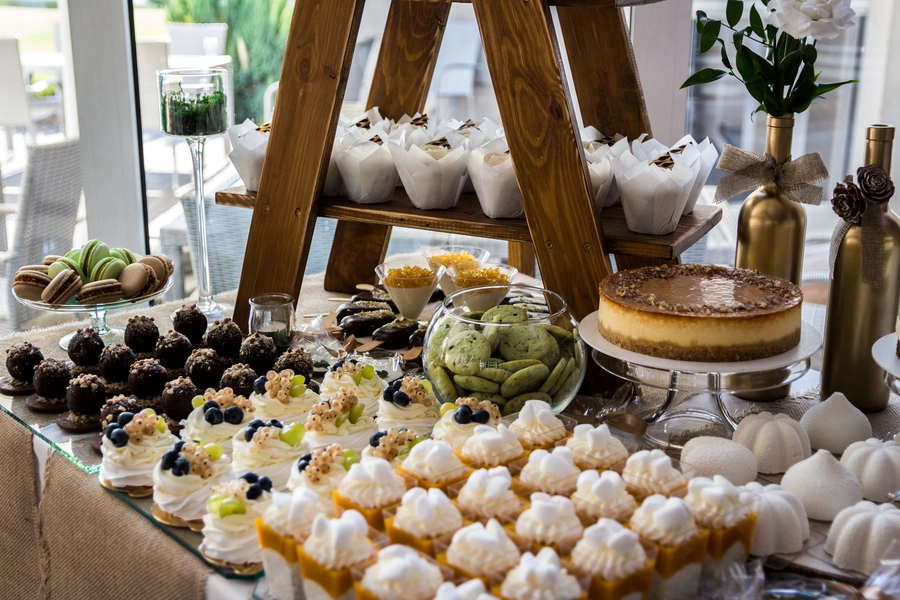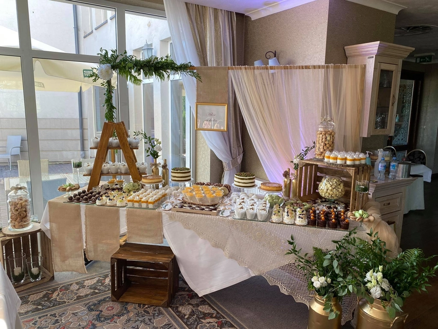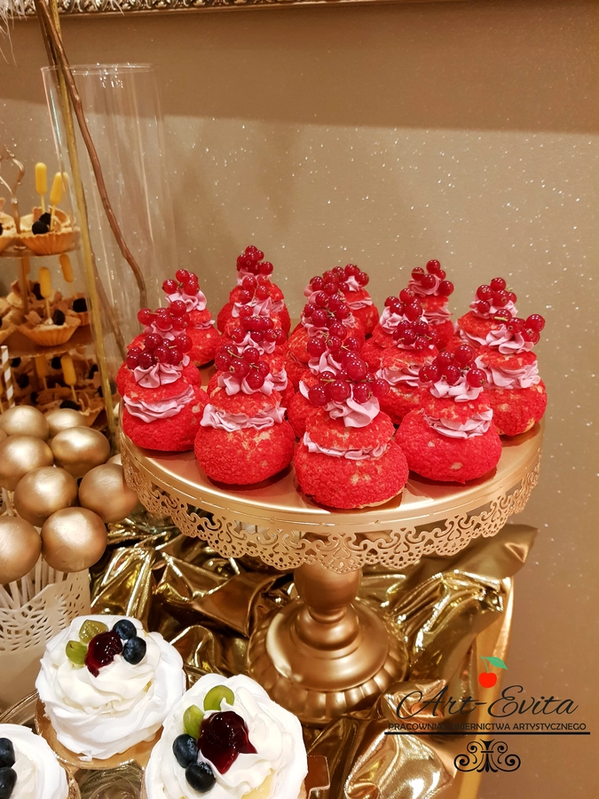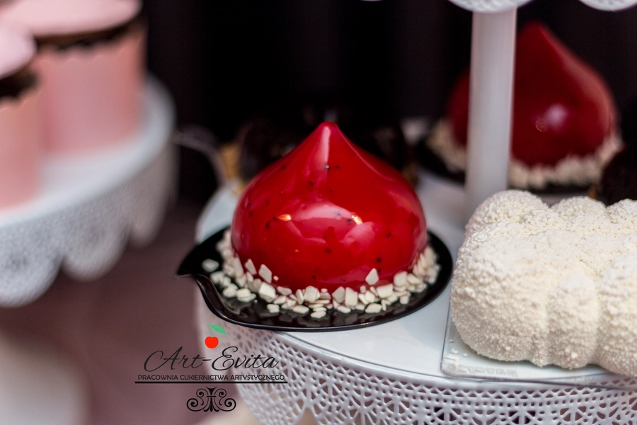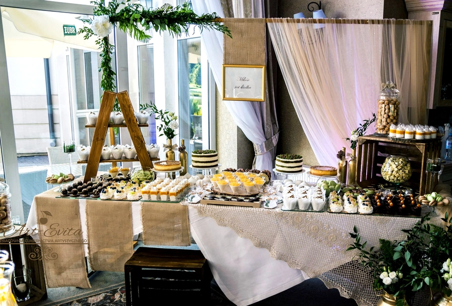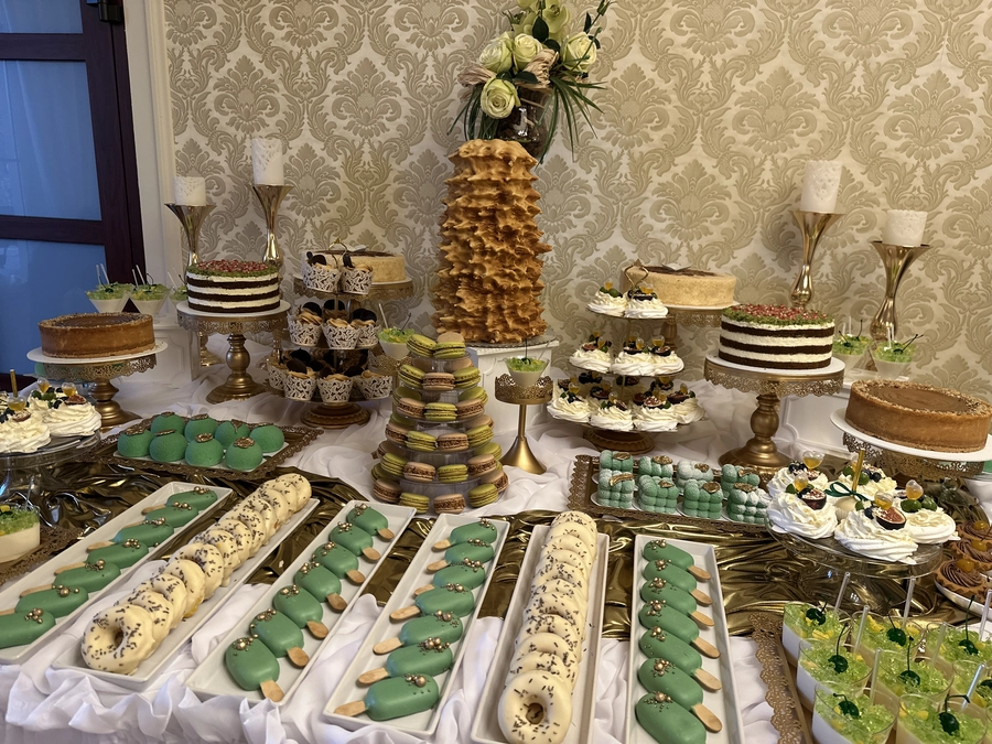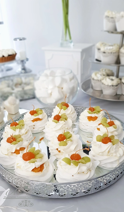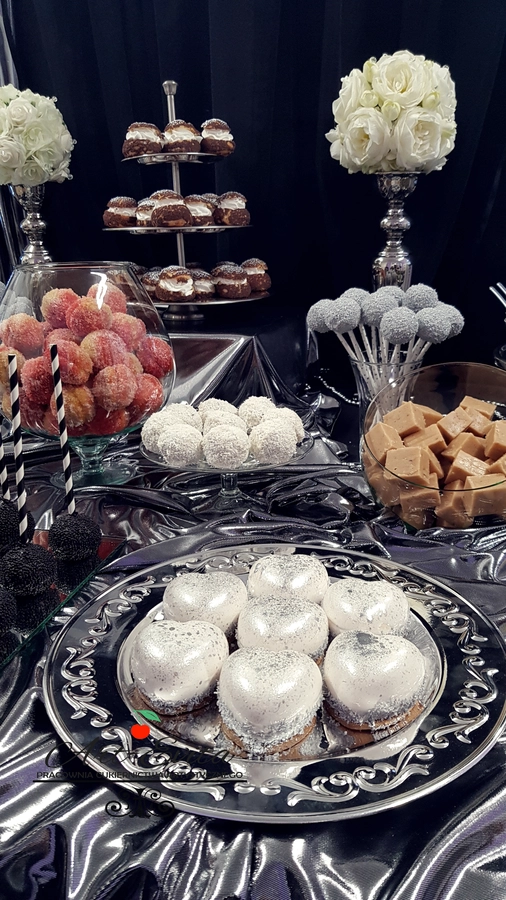 Są to przepięknie skomponowane nowoczesne słodkości w przeróżnych smakach, kolorach, w niewielkich porcjach i pojemnościach, tak aby gość weselny mógł spróbować chociaż kilku sztuk. A jest w czym wybierać! Są to mini deserki, mono porcje, mini pavlove, muffinki, cake popsy (lizaki z ciasta), pop sicles (lody z ciasta), nowoczesne oraz tradycyjne tartaletki, nowoczesne ptysie tzw. shu cakes, lizaczki bezowe, serniki o różnych smakach, tarty oraz wiele innych. Wszystko jest dowożone przeze mnie na salę, rozstawiane i dekorowane, tak aby pasowało do klimatu wesela stylem i kolorystyką.
