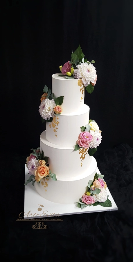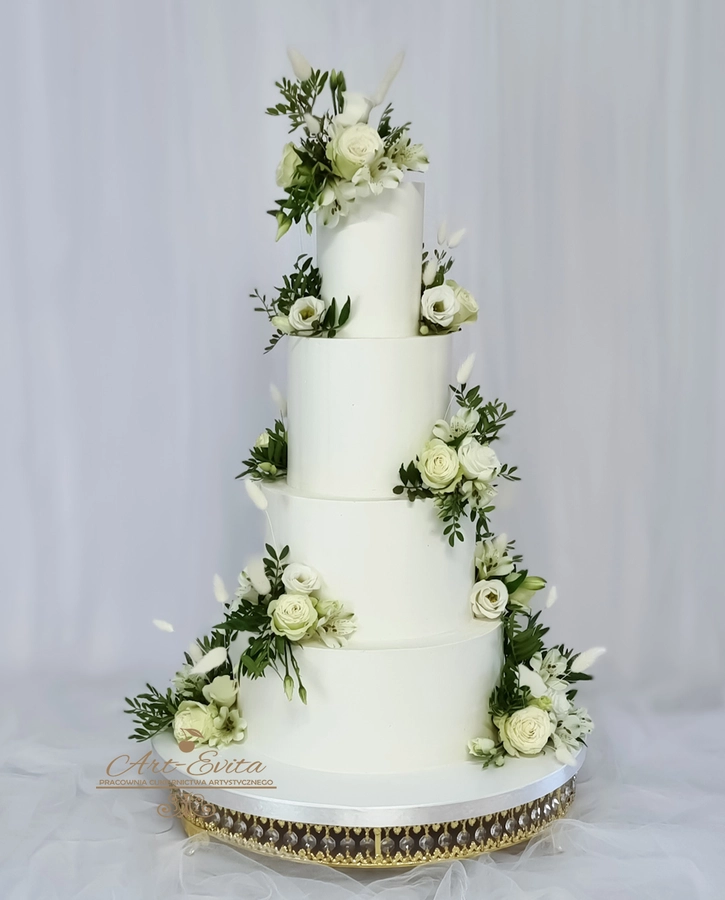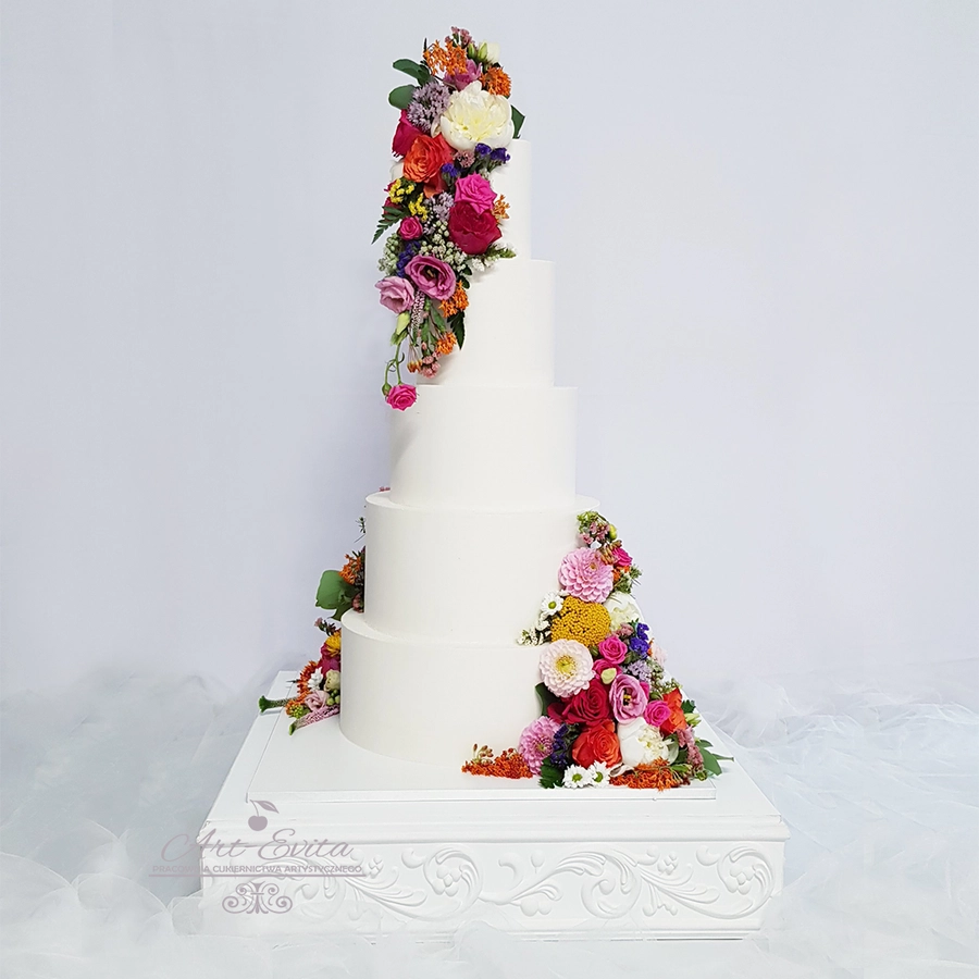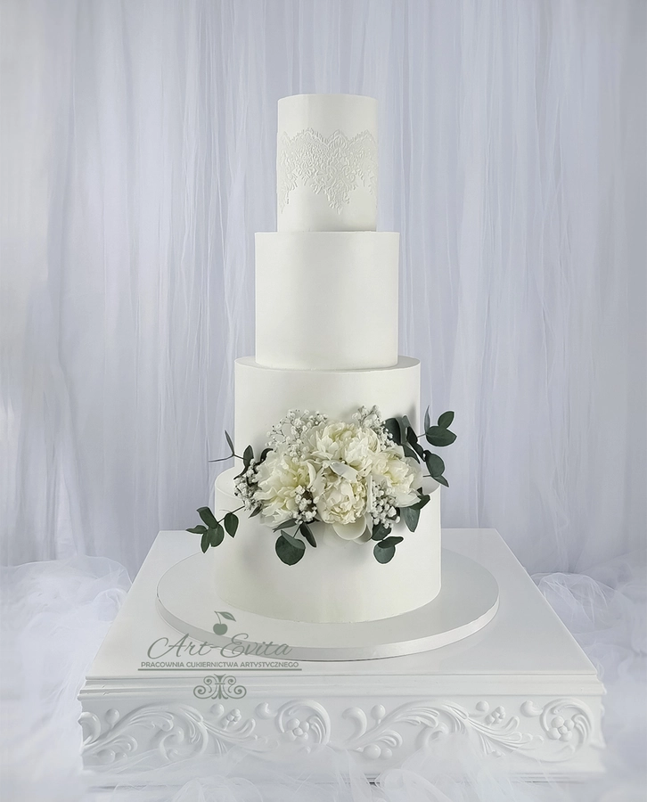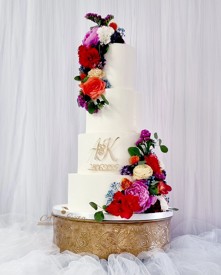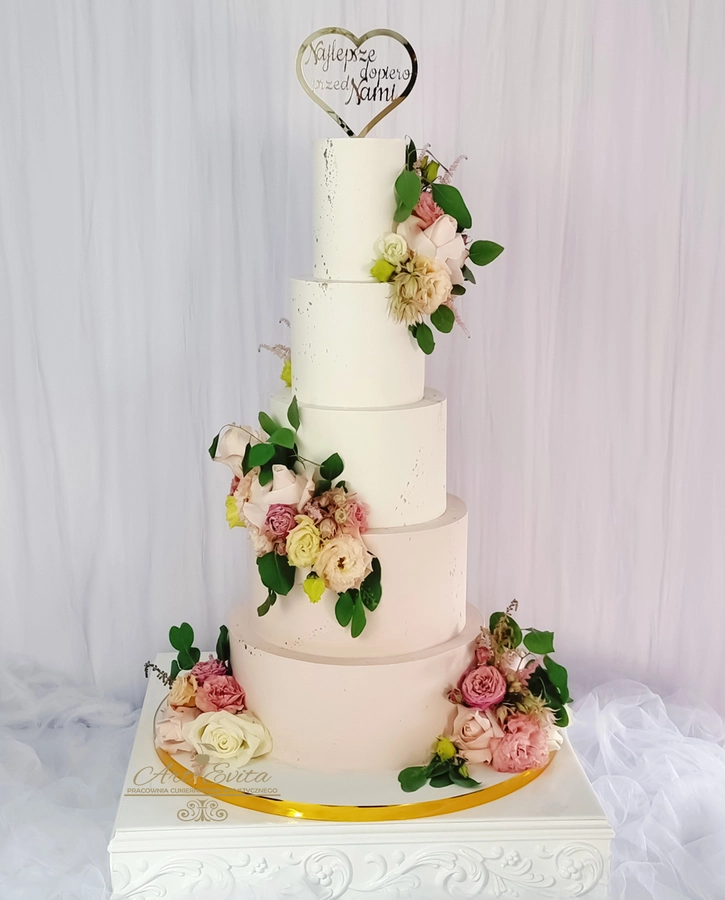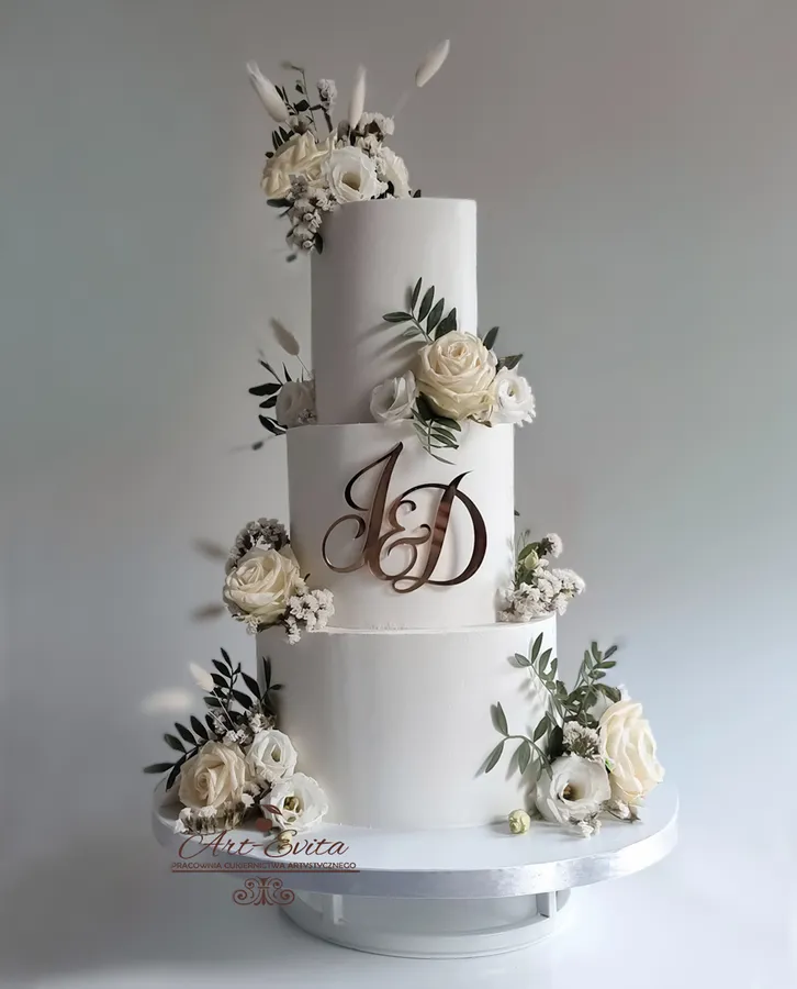 Takie torty nie potrzebują wielu ozdób, by wyglądać elegancko. Wystarczy kilka świeżych kwiatów, drobna gałązka zieleni lub delikatny akcent w kolorze przewodnim. To styl, który podkreśla świeżość i naturalny charakter uroczystości.