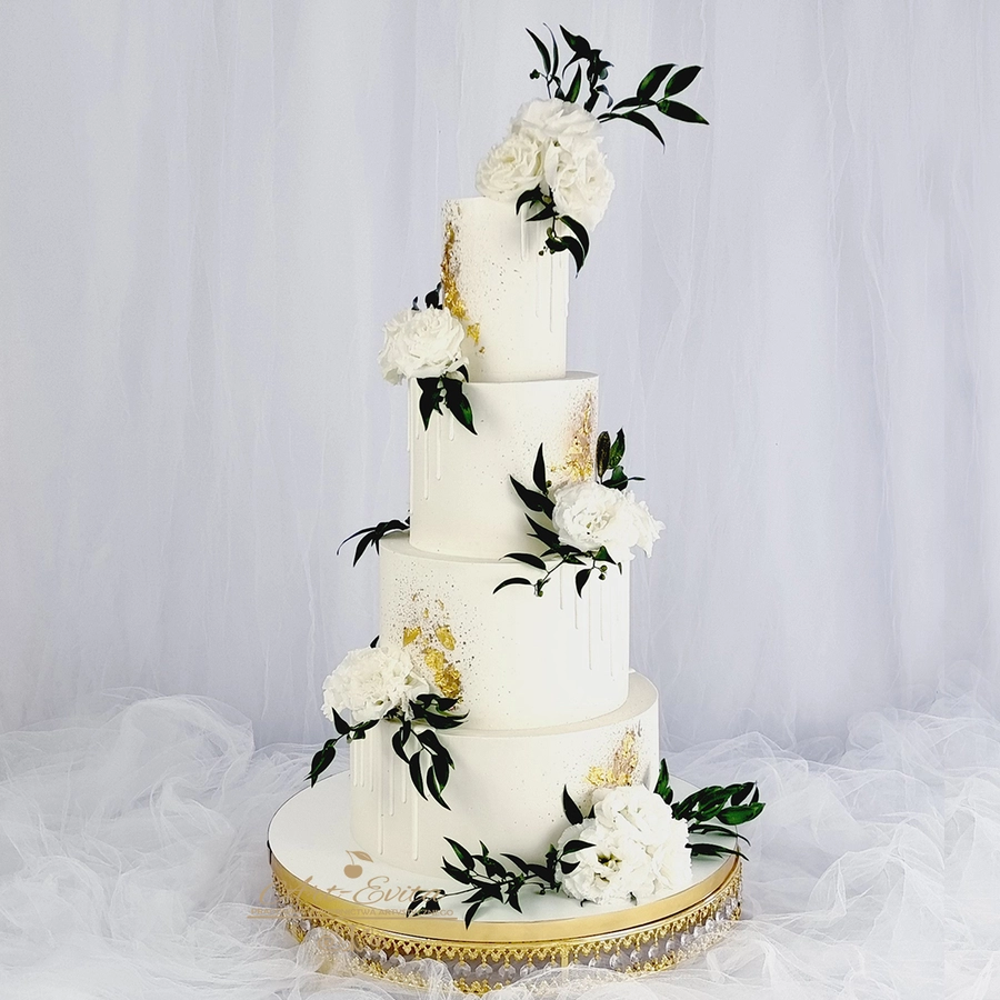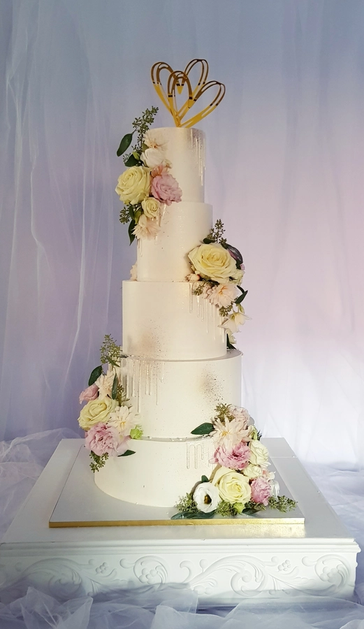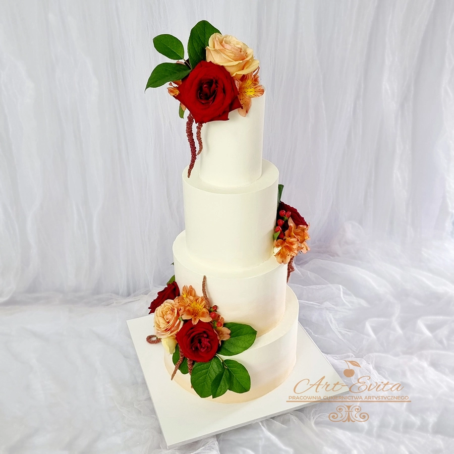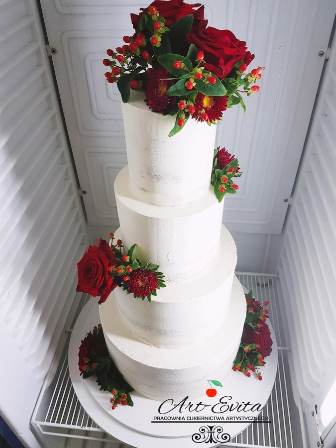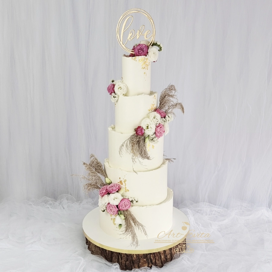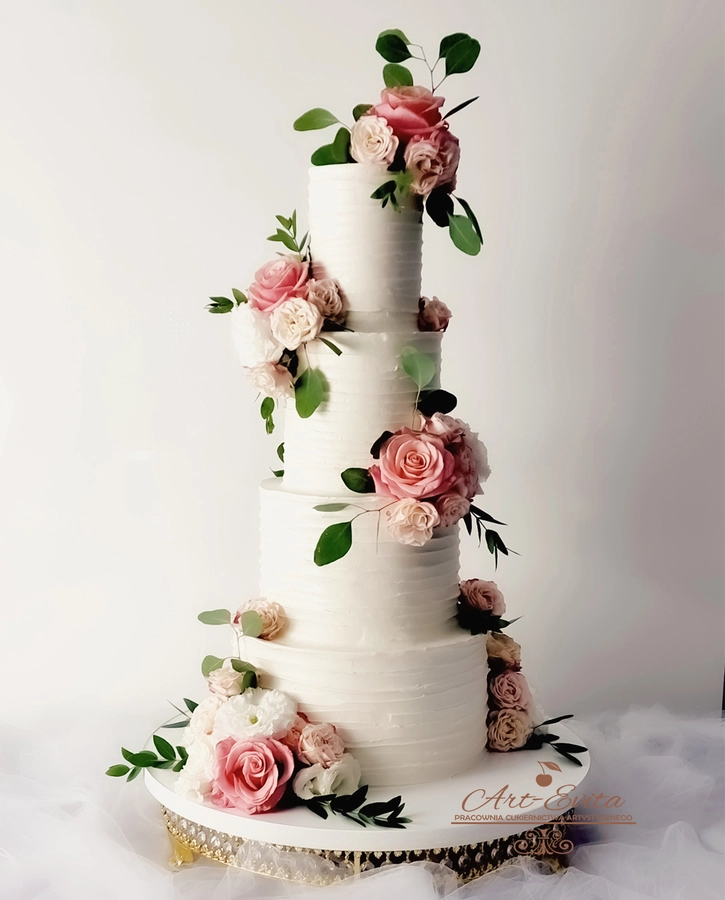 Takie torty nie potrzebują wielu ozdób, by wyglądać elegancko. Wystarczy kilka świeżych kwiatów, drobna gałązka zieleni lub delikatny akcent w kolorze przewodnim. To styl, który podkreśla świeżość i naturalny charakter uroczystości.