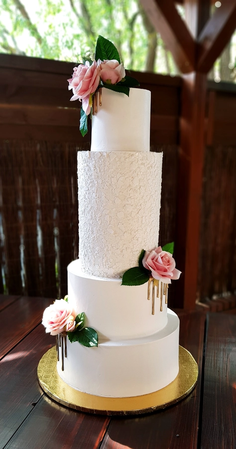 Kremowe wykończenie pozwala na stworzenie tortu w wielu odsłonach. Mogą to być delikatne odcienie bieli, jasne beże, pastelowe akcenty, a czasem efekt lekkiego muśnięcia kolorem. Na gładkiej powierzchni idealnie prezentują się drobne kwiaty, pojedyncze liście, niewielkie złote akcenty lub naturalne dekoracje dopasowane do stylu uroczystości. Dzięki temu tort jest elegancki, ale nieprzesadzony, a jego wygląd pozostaje spójny z dekoracjami sali. Torty dostarczam na terenie Białegostoku i okolic, dbając, by prezentowały się bez zarzutu od momentu przewozu aż po podanie.
