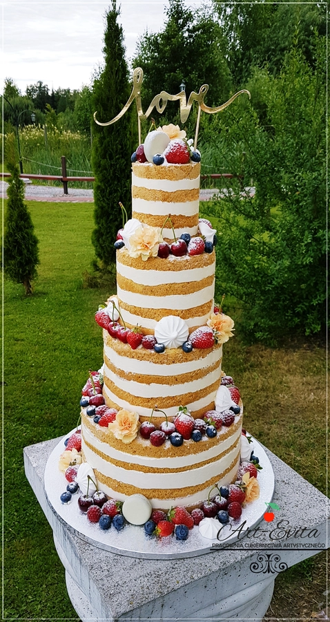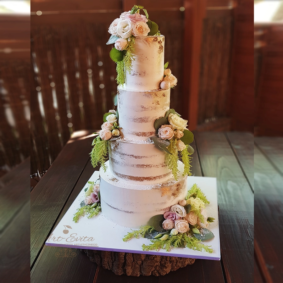 Rustykalne torty weselne wyróżniają się prostotą i elegancją. Zdobione są najczęściej żywymi kwiatami, suszonymi trawami, owocami, delikatnymi listkami czy pastelowymi akcentami, które podkreślają ich naturalny charakter. Każdy element dobieram tak, aby idealnie współgrał z motywem wesela.