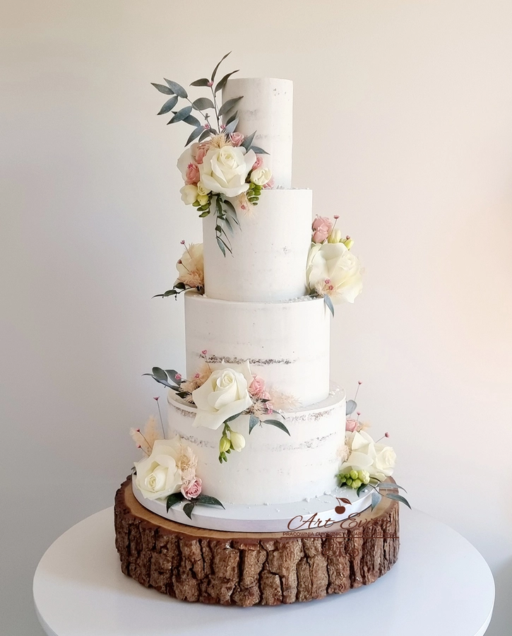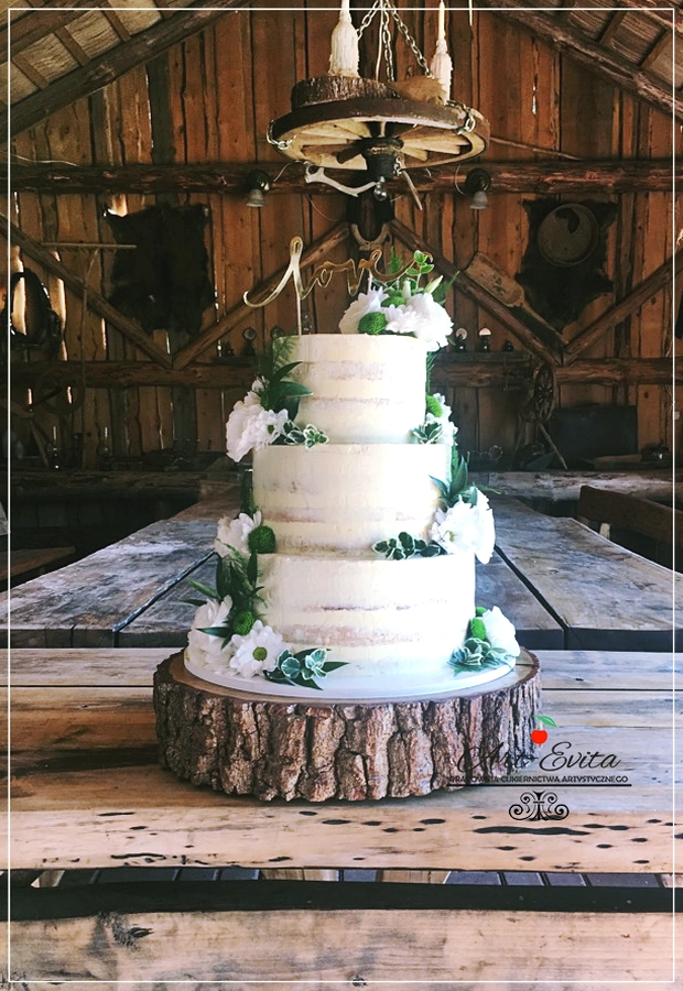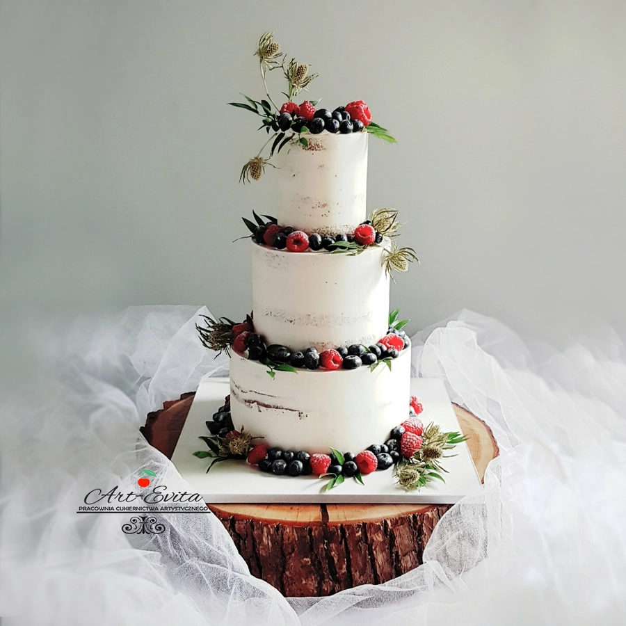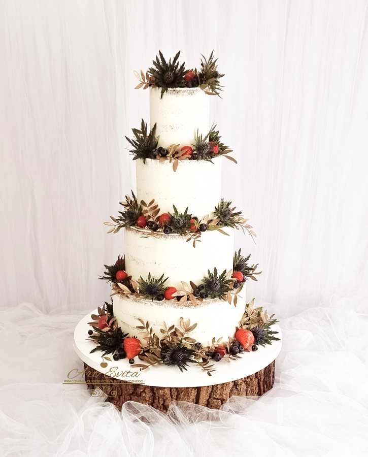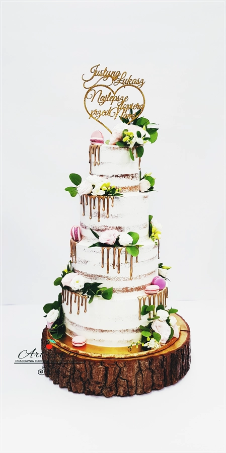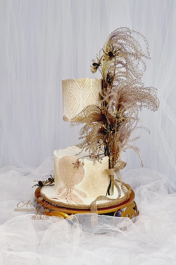 W rustykalnych wypiekach najczęściej stosuję kremowe tynki, semi-naked cake oraz naturalne, nieregularne struktury, które nadają tortowi lekkości. To doskonałe rozwiązanie dla Par Młodych, które cenią minimalizm i harmonijne, nienachalne dekoracje.