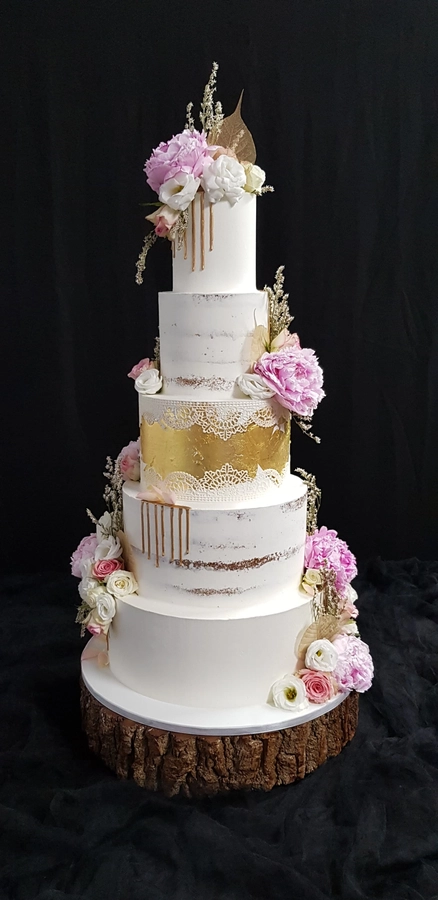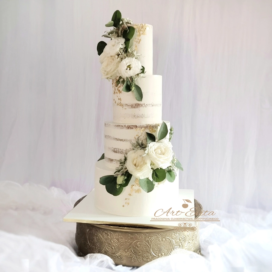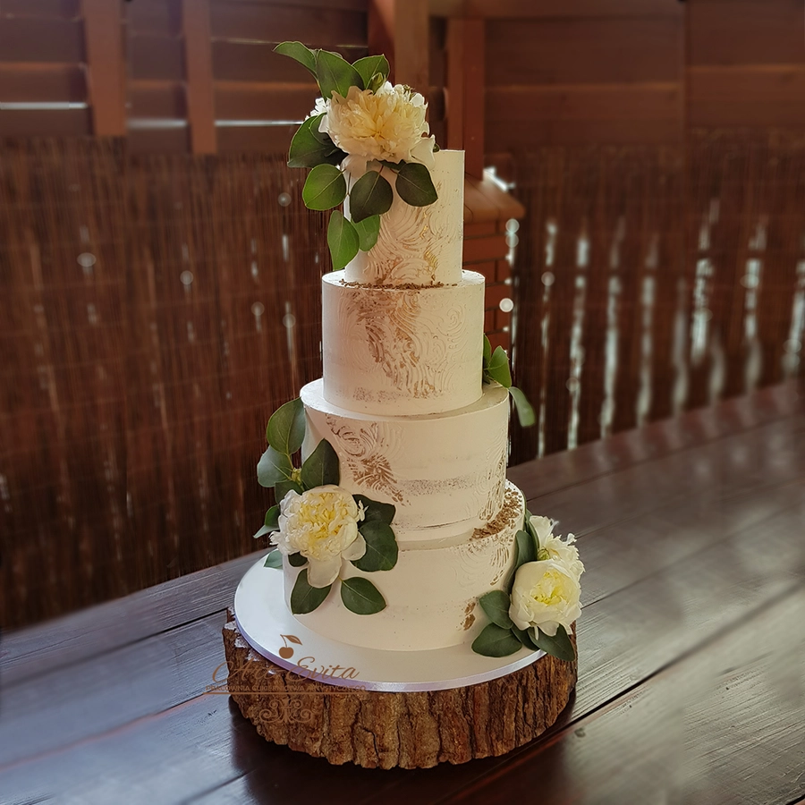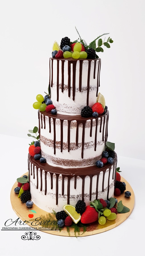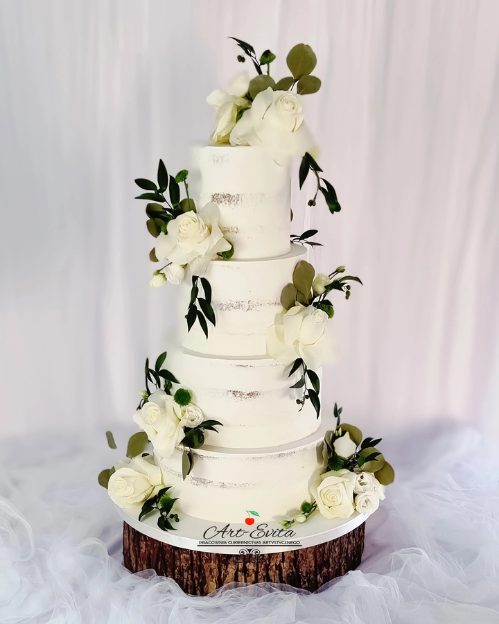 W rustykalnych wypiekach najczęściej stosuję kremowe tynki, semi-naked cake oraz naturalne, nieregularne struktury, które nadają tortowi lekkości. To doskonałe rozwiązanie dla Par Młodych, które cenią minimalizm i harmonijne, nienachalne dekoracje.