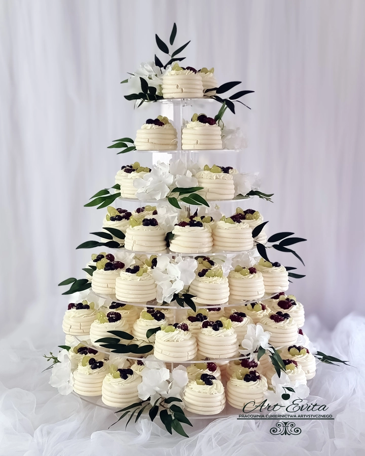 Torty z monoporcji, muffinek i mini pavlovych to propozycja dla tych, którzy chcą odejść od klasycznej formy i postawić na coś bardziej swobodnego, a zarazem efektownego. Zamiast jednego dużego tortu wybiera się kompozycję stworzoną z wielu małych deserów podanych w formie piętra lub ułożonych na paterach. Takie połączenie daje ogromną możliwość zabawy kształtem, smakiem i kolorystyką — każdy element może być inny, a mimo to całość układa się w spójną, elegancką kompozycję. To rozwiązanie szczególnie lubiane na weselach, gdzie Pary szukają nieoczywistej alternatywy dla tradycyjnego tortu.