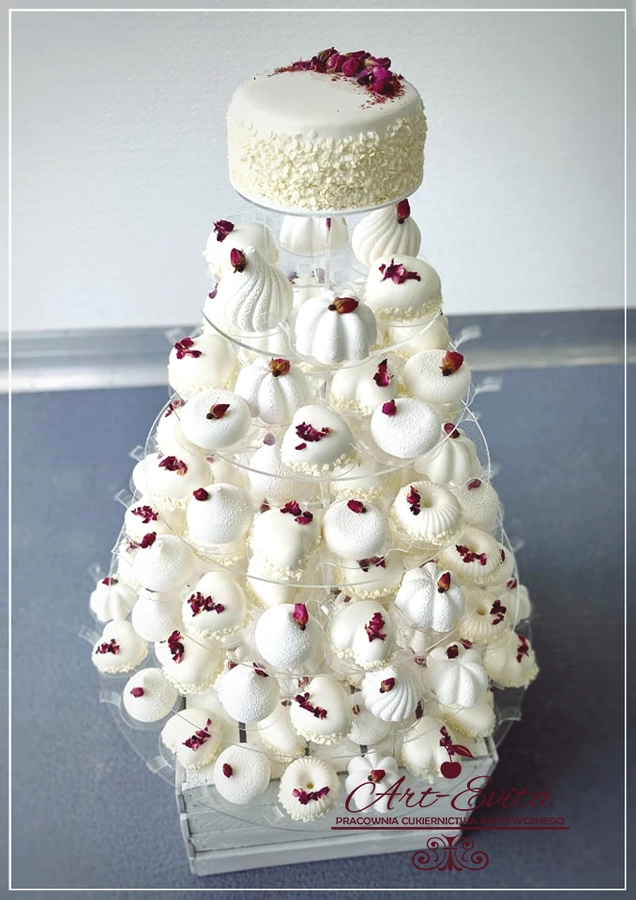 Mini pavlove, monoporcje i muffinki dają możliwość zbudowania tortu, który nie trzyma się sztywnej formy, a jednocześnie wygląda niezwykle spójnie. Dzięki temu każdy element może mieć własny charakter. Całość układa się w efektowną strukturę, która może zastąpić klasyczny tort lub stanowić jego ciekawą alternatywę. To rozwiązanie szczególnie doceniane na weselach, gdzie estetyka podania ma równie duże znaczenie co smak.