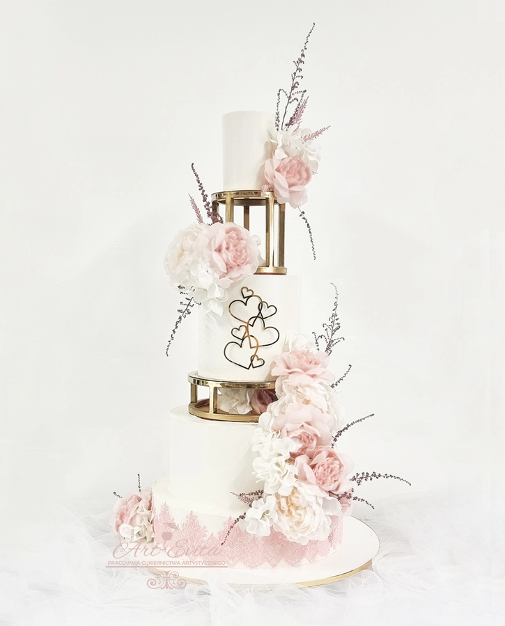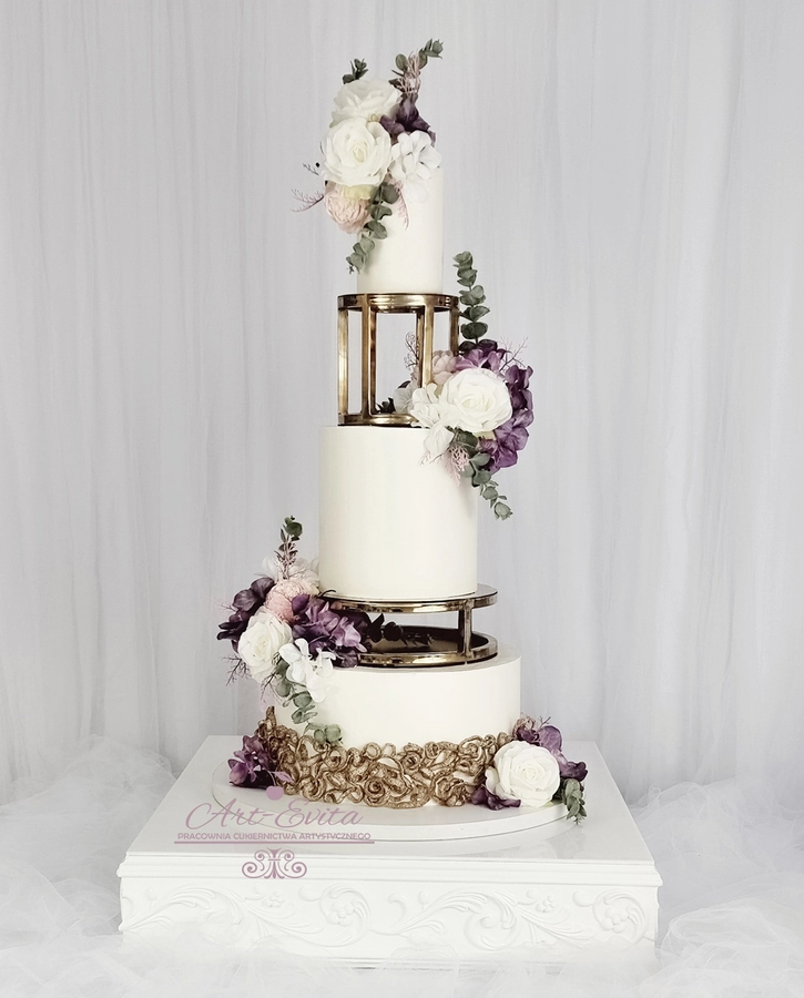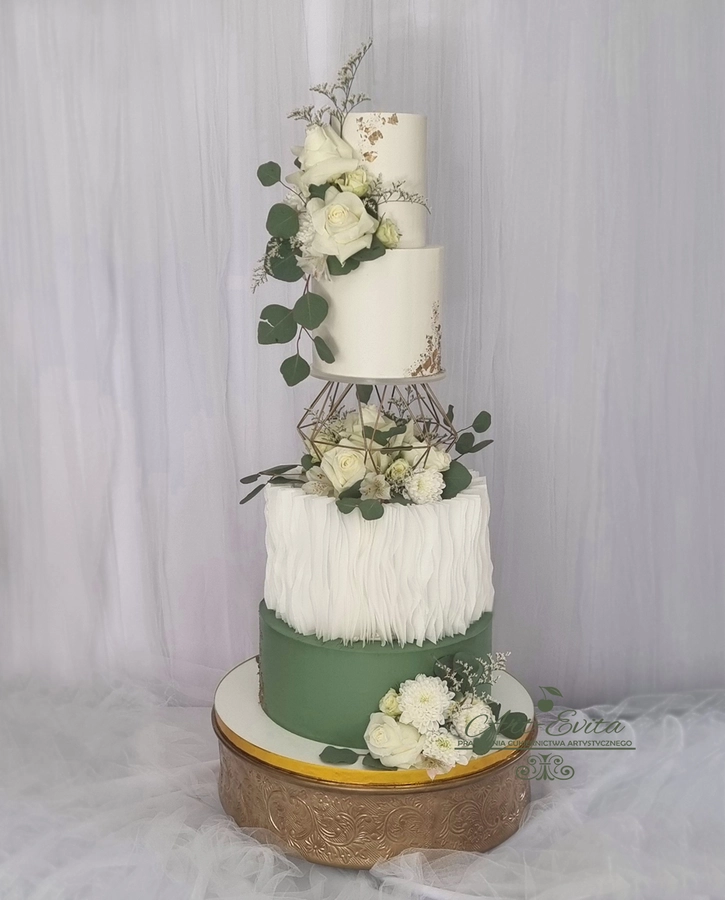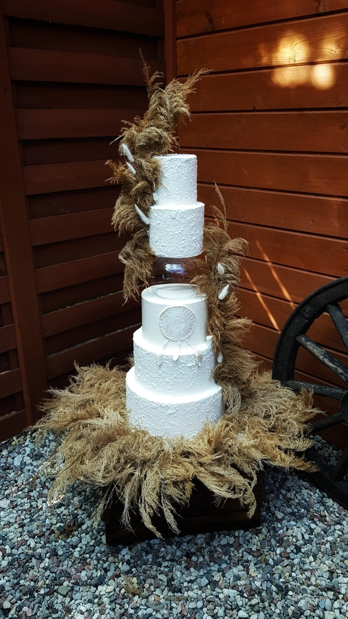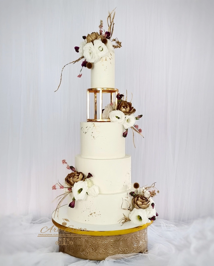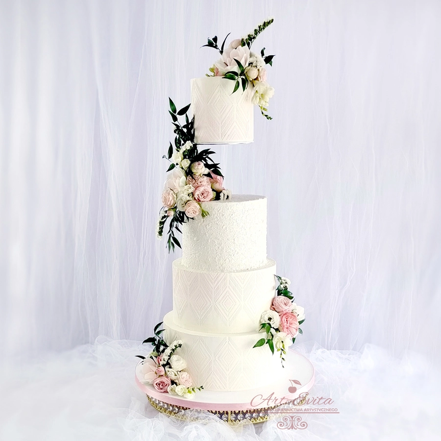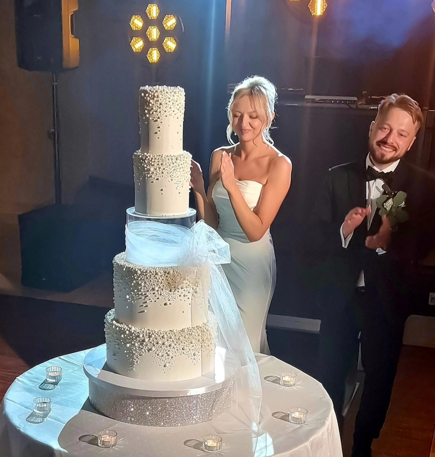 Przestrzeń pomiędzy piętrami daje wiele możliwości dekoracyjnych — od świeżych kwiatów, przez delikatne gałązki zieleni, po subtelne elementy glamour. Separator podkreśla charakter całej kompozycji i pozwala stworzyć tort, który przyciąga uwagę, jednocześnie nie przytłaczając pozostałych dekoracji weselnych. Każda konstrukcja powstaje na solidnej podstawie, dzięki czemu tort pozostaje stabilny podczas transportu oraz podawania, co jest niezwykle istotne przy wielopiętrowych projektach weselnych.