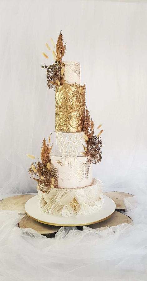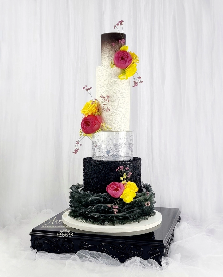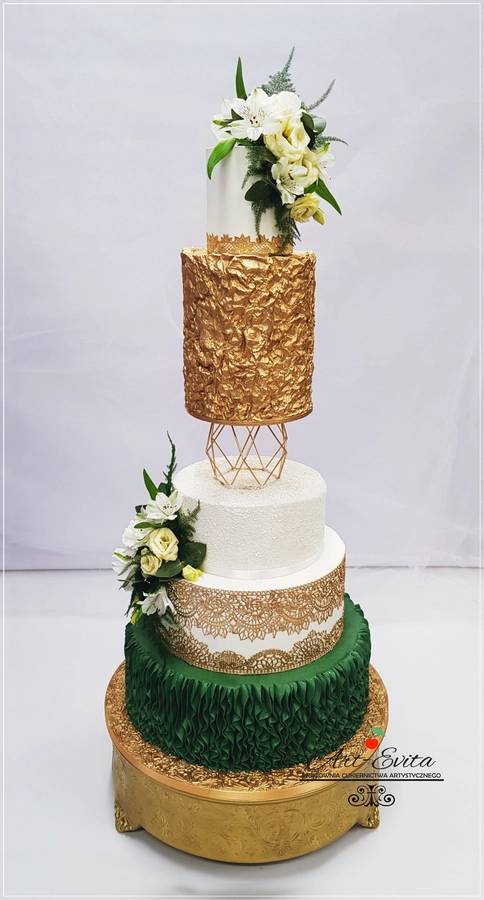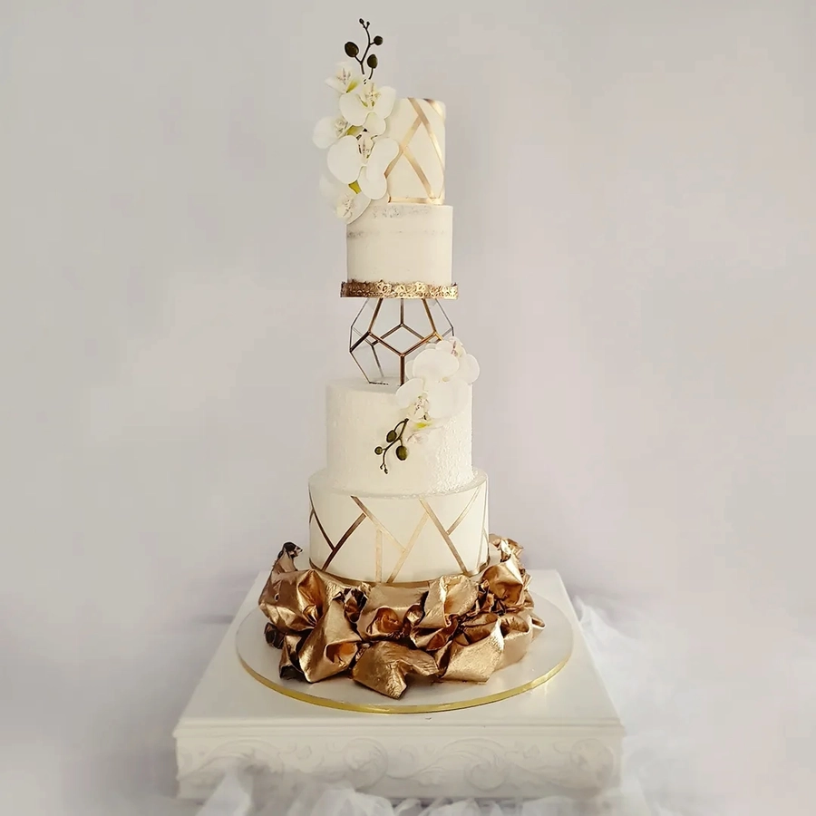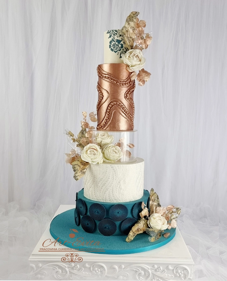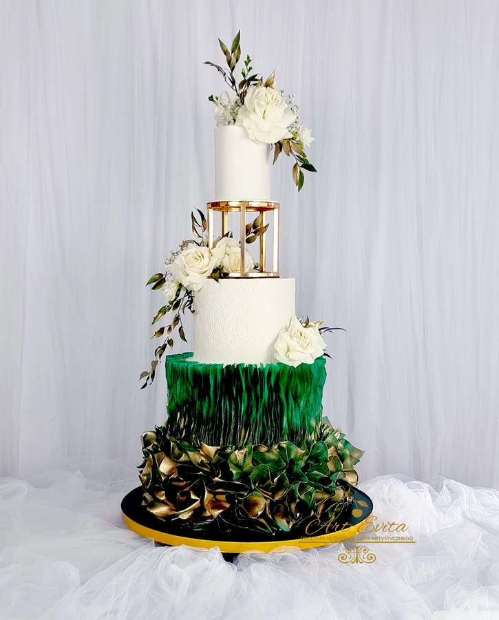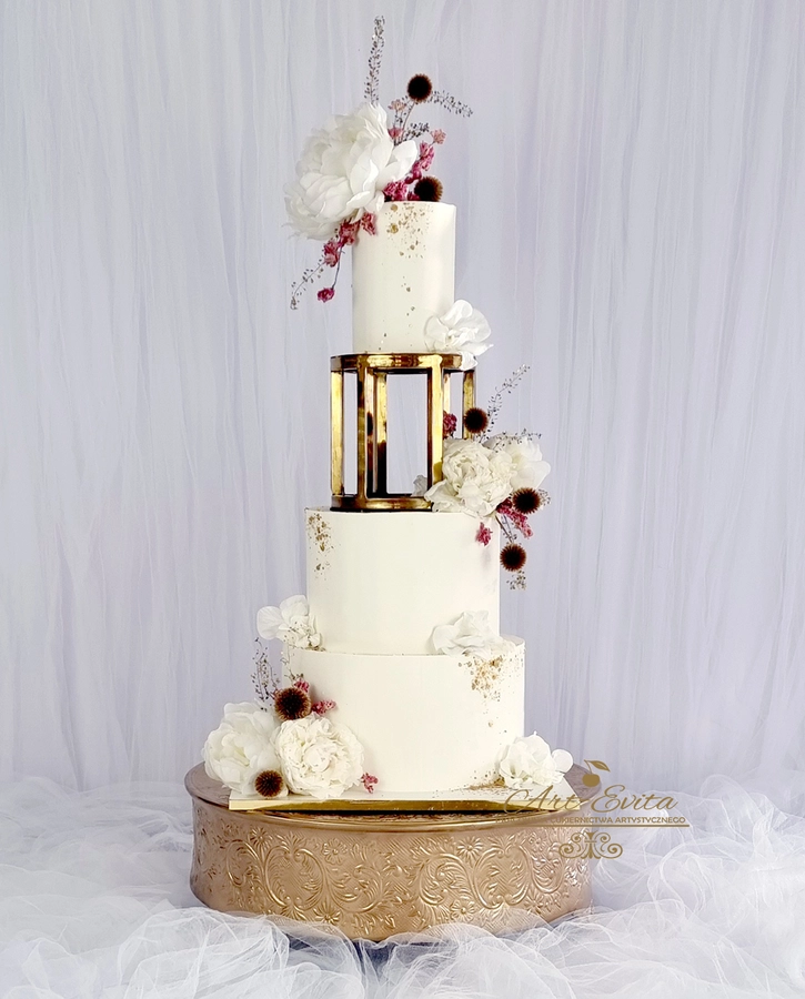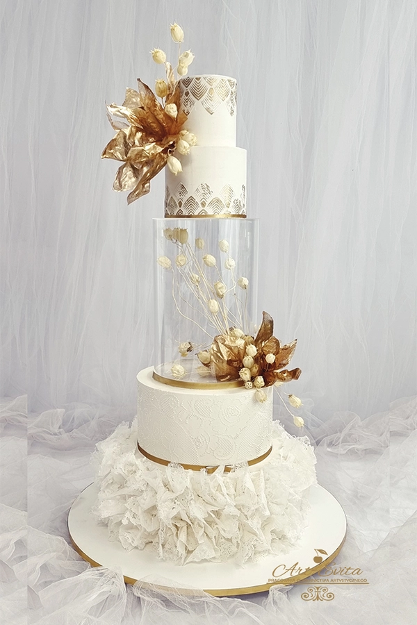 Przestrzeń pomiędzy piętrami daje wiele możliwości dekoracyjnych — od świeżych kwiatów, przez delikatne gałązki zieleni, po subtelne elementy glamour. Separator podkreśla charakter całej kompozycji i pozwala stworzyć tort, który przyciąga uwagę, jednocześnie nie przytłaczając pozostałych dekoracji weselnych. Każda konstrukcja powstaje na solidnej podstawie, dzięki czemu tort pozostaje stabilny podczas transportu oraz podawania, co jest niezwykle istotne przy wielopiętrowych projektach weselnych.
