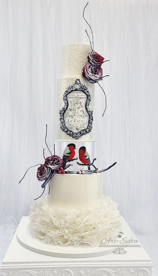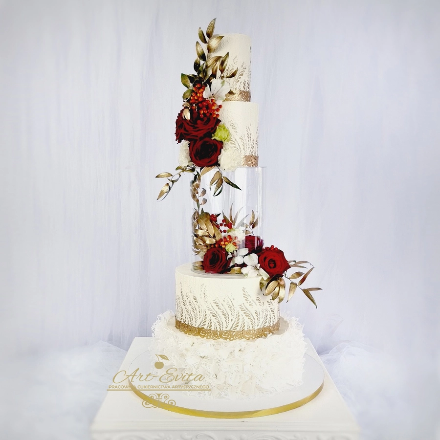 Separator sprawia, że tort zyskuje zupełnie inną prezencję – piętra wyglądają na lżejsze, a cała konstrukcja staje się bardziej wyeksponowana. Taka forma świetnie sprawdza się na przyjęciach, gdzie tort pełni rolę jednej z głównych dekoracji. Dzięki podniesionej sylwetce wypiek pięknie prezentuje się zarówno na żywo, jak i na zdjęciach, tworząc wyjątkowo efektowny moment podania tortu weselnego.